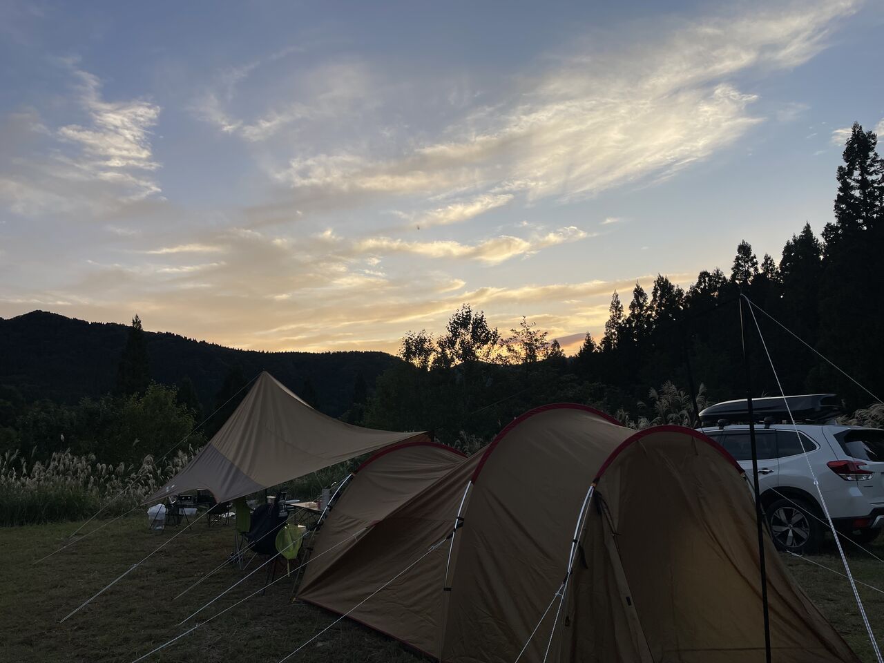 今回のテントとタープは事前にYouTubeで予習したものの、、、やはり1時間半程かかりましたがどうに
